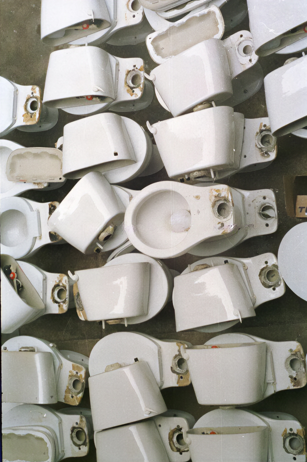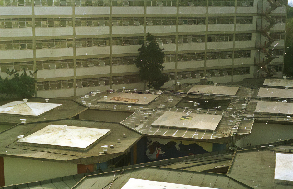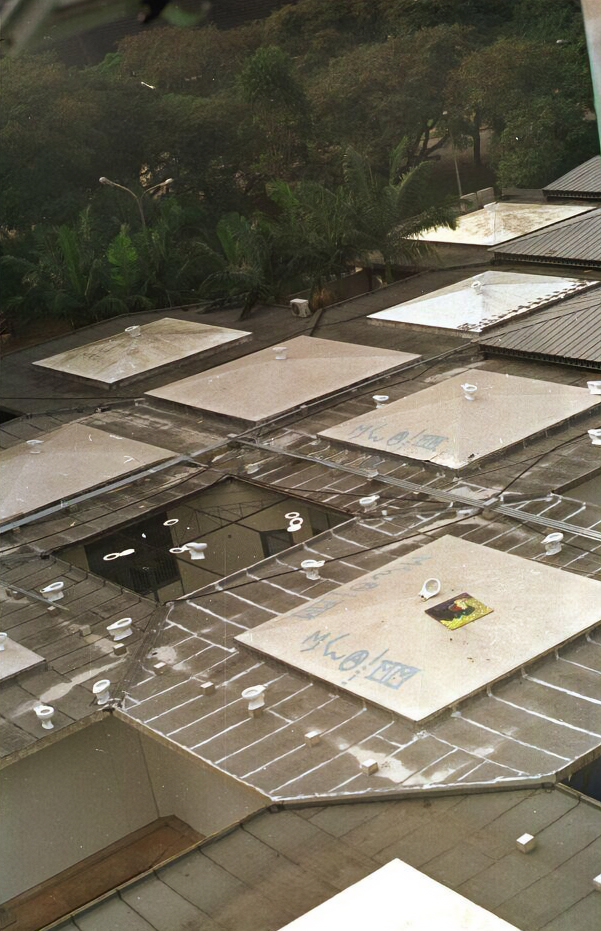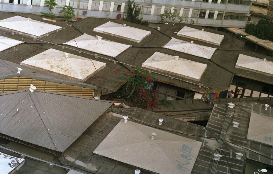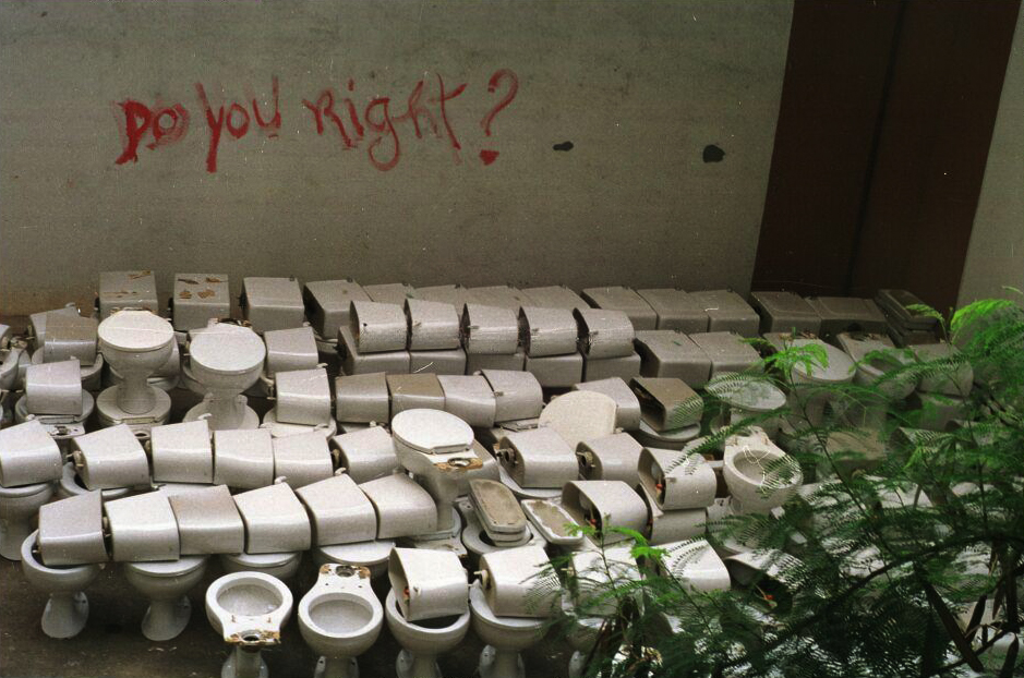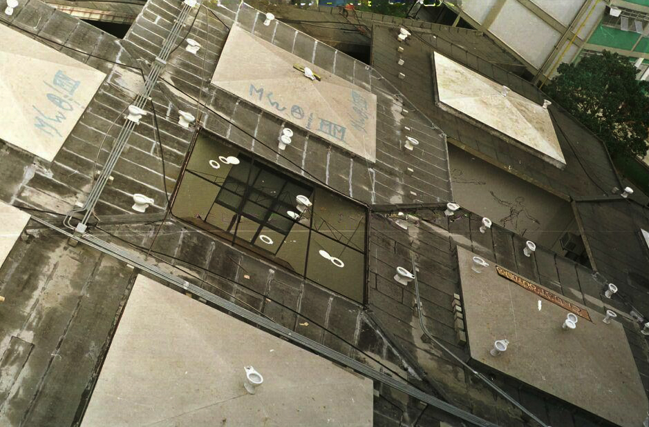 Privadas que serviriam para o Crusp no teto das "colmeias" do IEB, denunciando a demora da universidade para instalá-las.