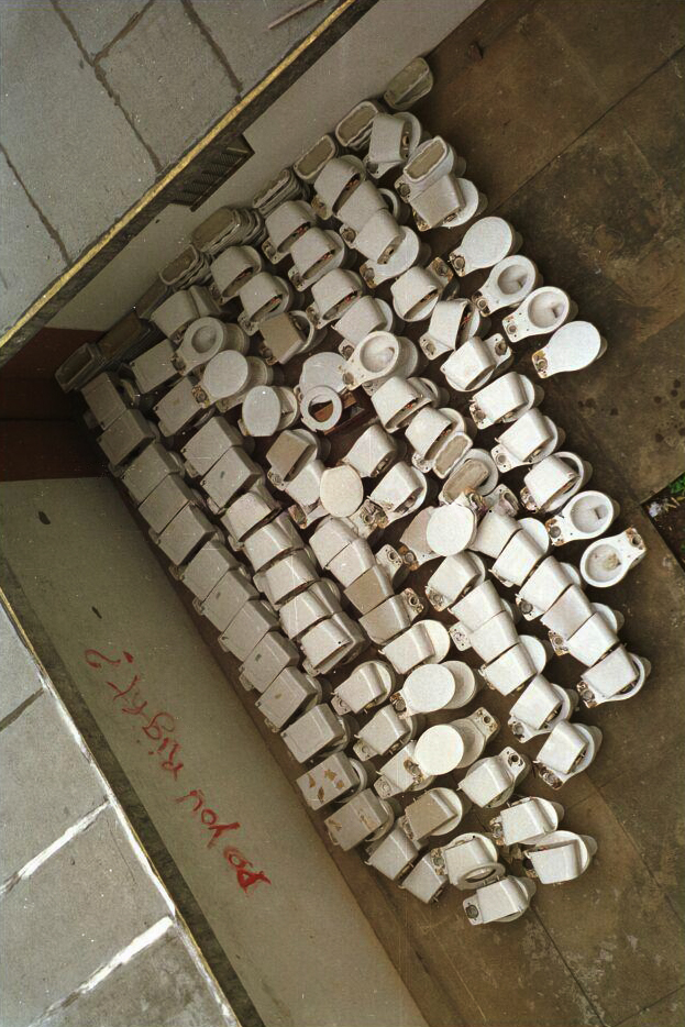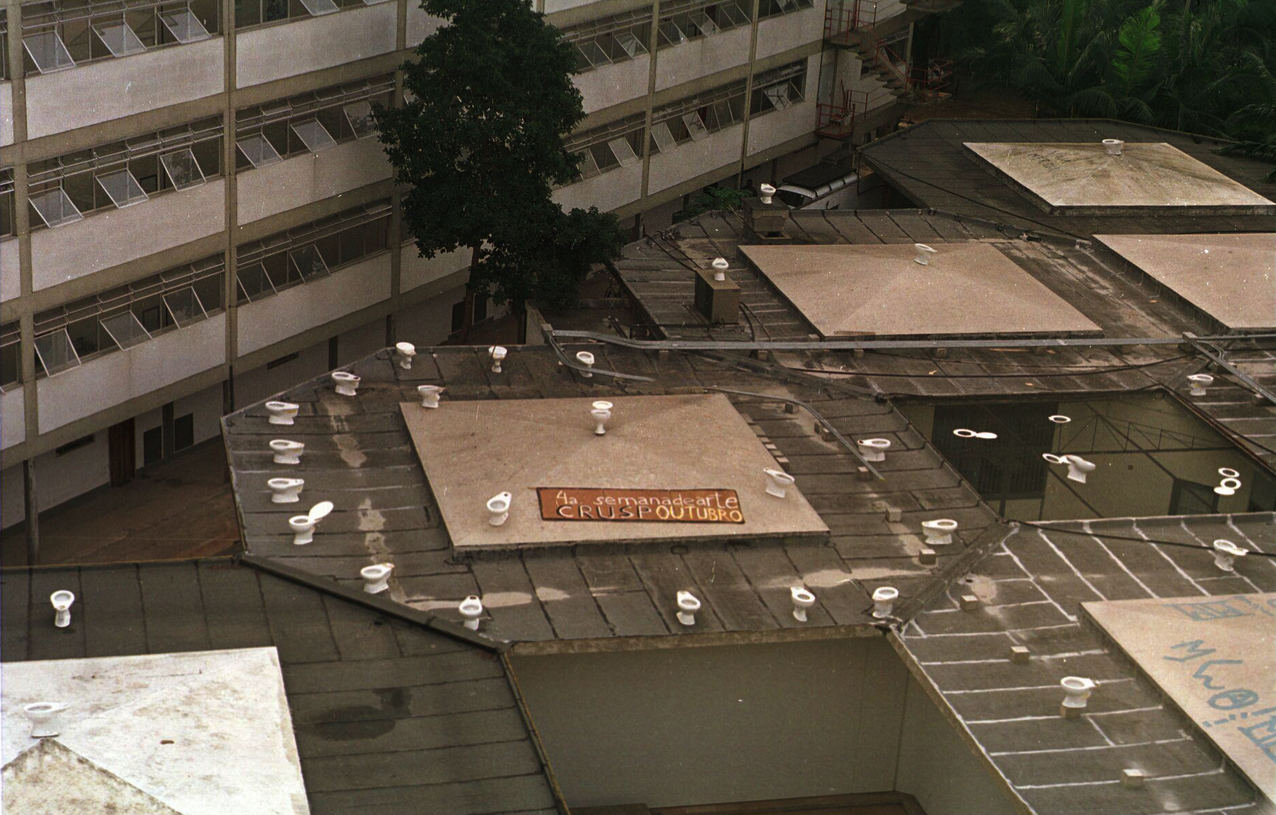 Vasos sanitários sobre as colméias entre os bloco B e D, colocados durante a madrugada por cerca de 30 estudantes como intervenção artística para a divulgação da 4ª Semana de Arte do Crusp.